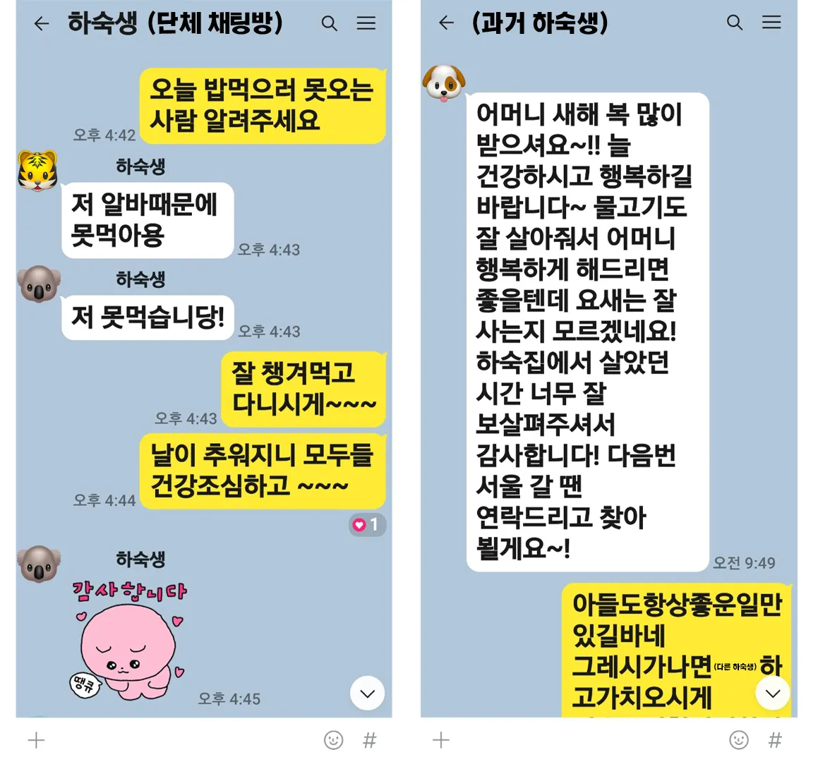 정삼남 할머니가 하숙생들과 나눈 카톡 캡처 2장. 첫 번째 캡처는 단체 채팅방 화면으로, 할머니가 저녁을 먹지 못하는 하숙생들에게 “잘 챙겨먹고 다니시게~~~ / 날이 추워지니 모두들 건강조심하고 ~~~”라는 문자를 남긴 내용이다. 두 번째 화면 캡처는 과거 하숙생이 삼남 할머니에게 보낸 문자로, “하숙집에서 살았던 시간 너무 잘 보살펴주셔서 감사합니다! 다음번 서울 갈 땐 연락드리고 찾아뵐게요~!”라는 내용이 적혀 있다.