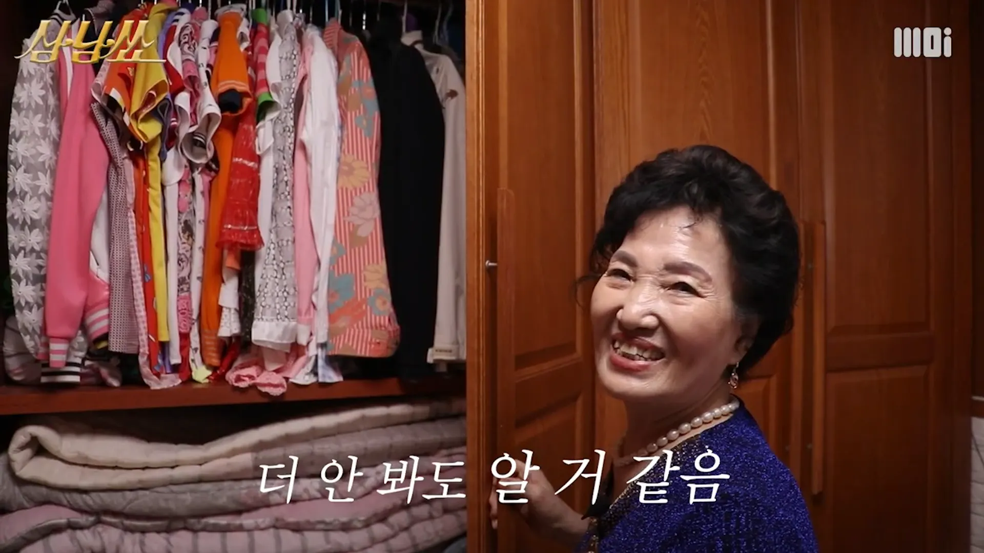 구입처가 절로 궁금해지는 옷들이 가득한 옷장을 연 채, 카메라를 쳐다보며 웃고 있는 삼남 할머니. 화면 아래엔 “더 안 봐도 알 거 같음”이라는 자막이 적혀 있다.