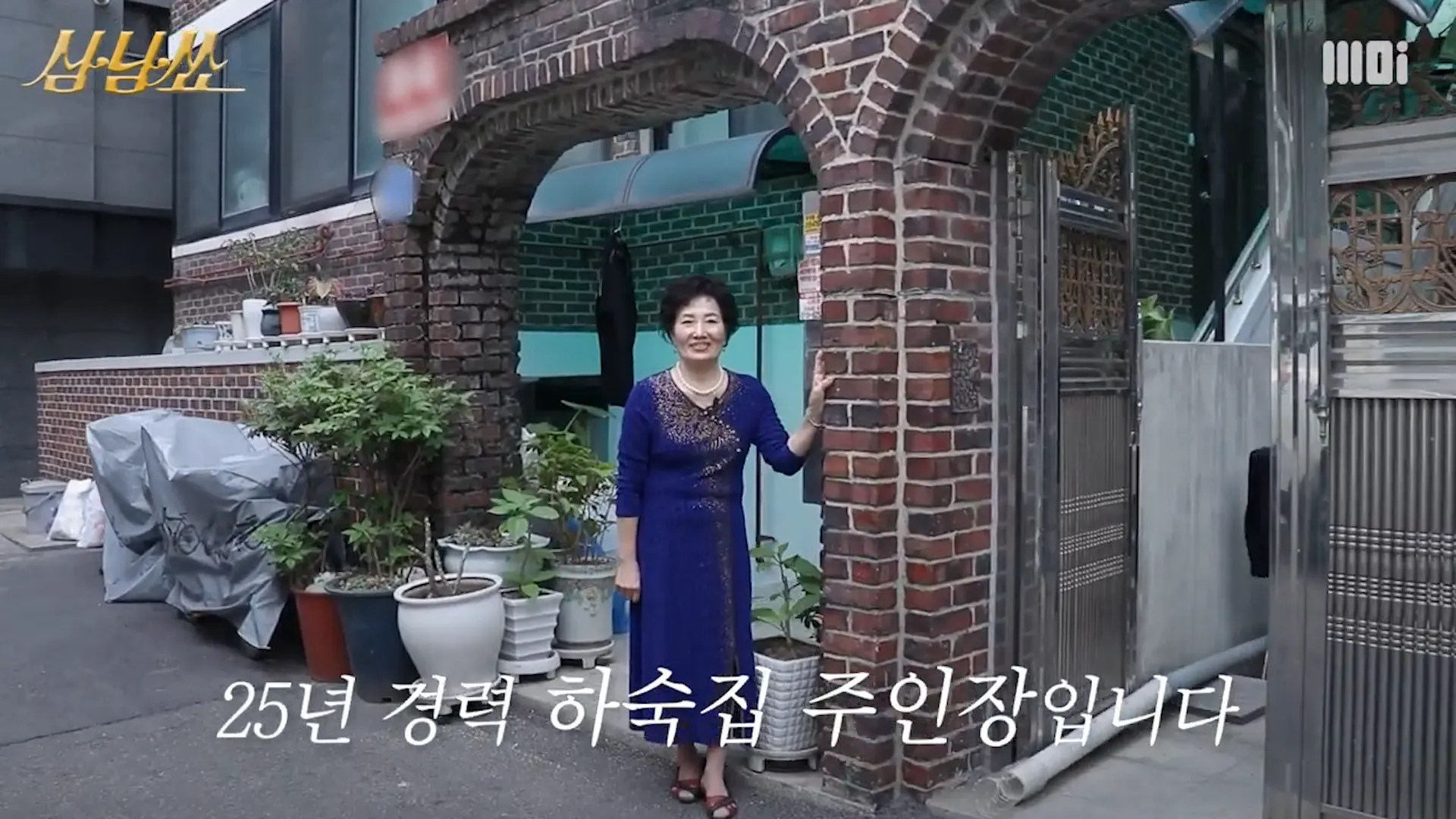 집 앞에 서서 포즈를 취하고 있는 삼남 할머니. 화면 아래엔 “25년 경력 하숙집 주인장입니다”라는 자막이 적혀 있다.