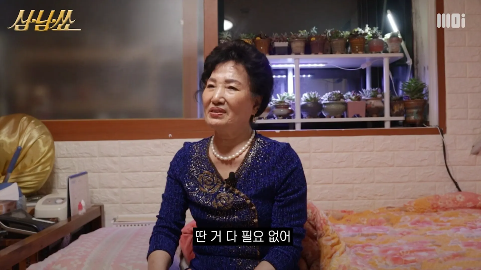 거실에 쪼그려 앉아 수조를 바라보는 정삼남 할머니. 화면 아래엔 “(집사의 숙명) 어디 못 가고 집으로 맨날 들어오고”라는 자막이 적혀 있다. 온 집안에 가득한 다육이와 물고기는 할머니가 지갑으로 낳아 마음으로 기른 자식들이다.