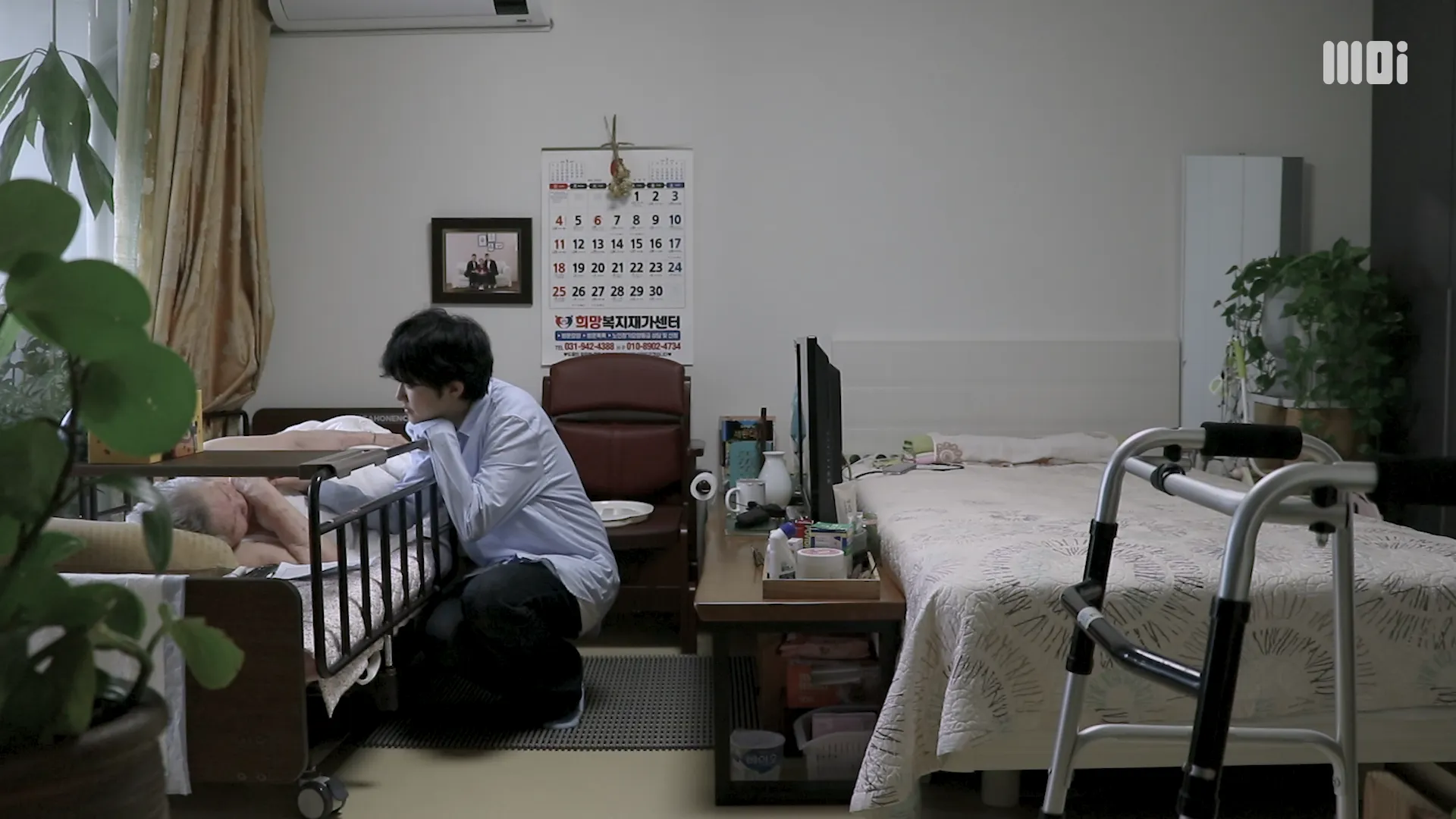 할머니가 누운 방을 단출히 비추는 화면 안으로 손녀가 등장한다. 손녀는 할머니 앞에 쪼그려 앉아 할머니와 다정한 대화를 나눈다.