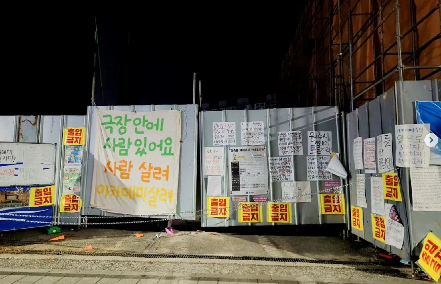 아카데미극장을 둘러싼 철제 공사 가림막 사진. 쇠사슬로 막힌 입구엔 ‘극장 안에 사람 있어요/사람 살려/아카데미 살려’라는 손 글씨가 적힌 대형 천이 걸려있다. 벽면 곳곳에 시민들이 붙인 손 글씨 피켓과 시청에서 붙인 ‘출입 금지’ 스티커가 빼곡히 붙어 있다.