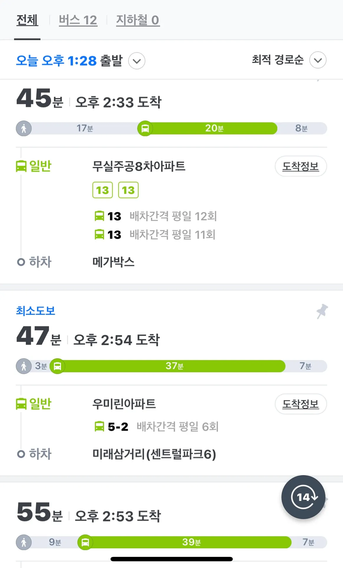 지도 어플로 대중교통 경로를 조회한 화면 캡처. 버스 배차간격이 시간이 아닌 횟수로 안내되어 있다.