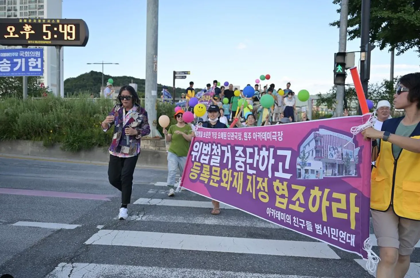 현수막을 들고 횡단보도를 건너는 사람들. 현수막엔 ‘위법철거 중단하고 등록문화재 지정 협조하라’는 문구가 적혀 있다. 현수막 뒤로 이어지는 행렬 속 사람들이 색색의 풍선을 들고 있다. 현수막 옆에는 야마가타 트윅스터(뮤지션)이 한 손에 마이크를 들고 시민과 함께 걷고 있다.