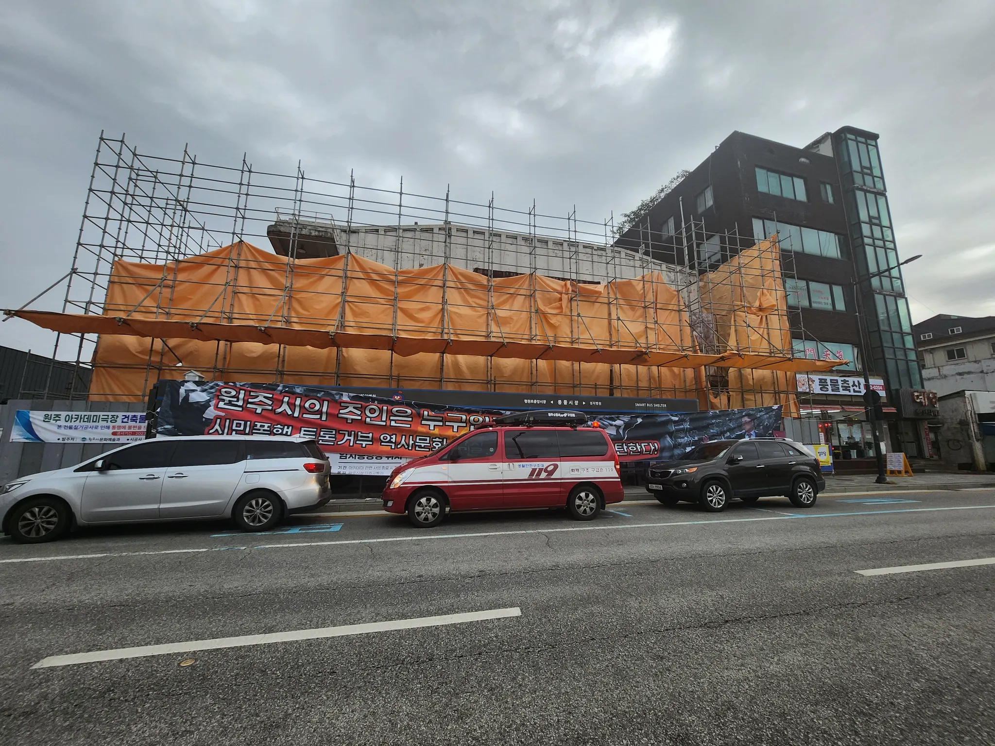 공사용 가림막으로 둘러싸인 아카데미극장 전면을 넓게 찍은 사진. 하늘은 흐리다. 주황색 가림막이 반쯤 흘러내려서 극장 상부가 드러나 있다. 극장 앞 버스 정류장은 ‘원주시의 주인은 누구인가’라고 적힌 현수막에 가려져 있고, 그 앞에 승용차 2대와 구급차 한 대가 서 있다.